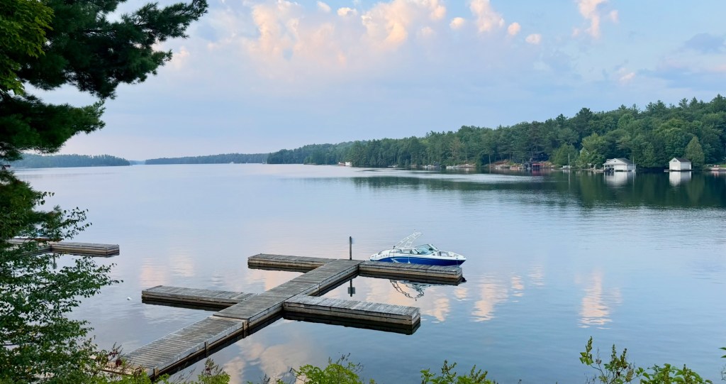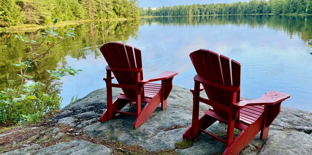 One morning, just after sunrise, I stood beside the lake. The surface was smooth as glass, trees lining the far shore in the early morning sun. A canoe paddle dipped gently into the water. A couple of Muskoka chairs at the lake’s edge invited me to stop. The world hushed.